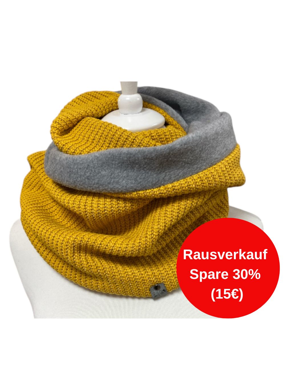 Der weiche Grobstrick in Senfgelb schmiegt sich angenehm an und sorgt für wohlige Wärme an kalten Tagen. Der Schal wird zweimal um den Hals gewickelt und sitzt dadurch perfekt – weder zu eng noch zu locker.
