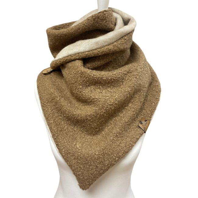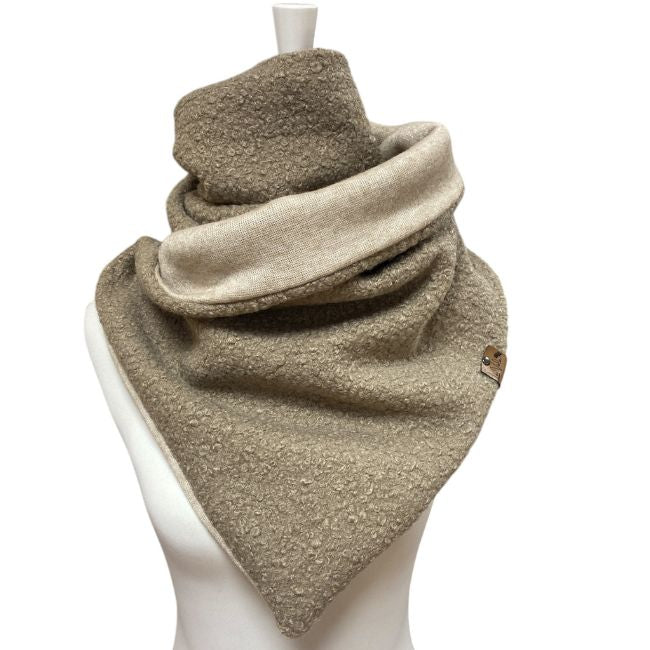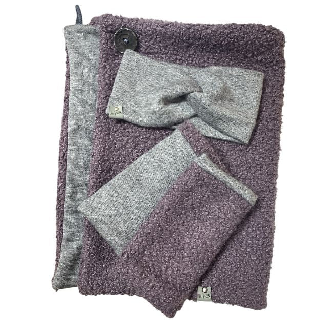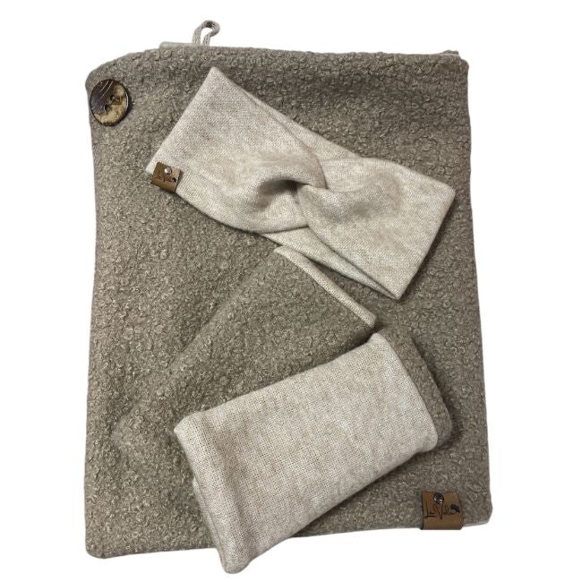 Kuscheliges Set mit Stil – Wickelschal Boucléstoff, Stirnband & Stulpen