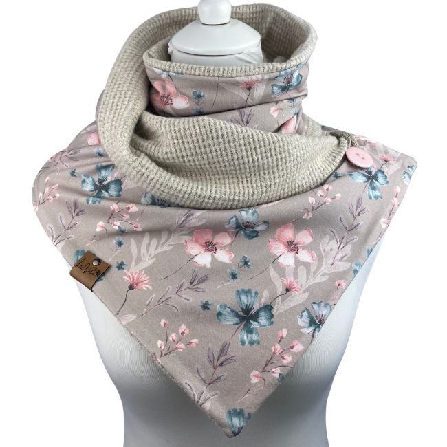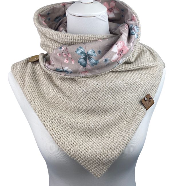 Der Wickelschal hat die Optik eines Dreiecktuchs. Er ist herrlich weich und kuschelig und kann ebenfalls von beiden Seiten getragen werden. Der Schal wird 2x um den Hals geschlungen und mit einem Knopf geschlossen.