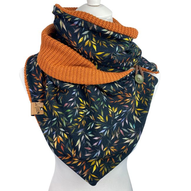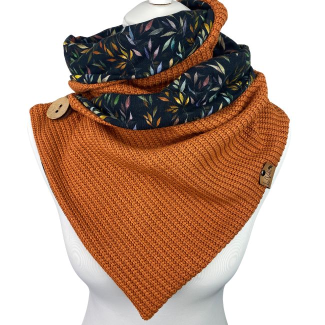 Der Wickelschal hat die Optik eines Dreiecktuchs. Er ist herrlich weich und kuschelig und kann ebenfalls von beiden Seiten getragen werden. Der Schal wird 2x um den Hals geschlungen und mit einem Knopf geschlossen.