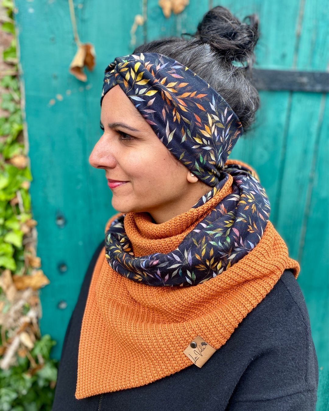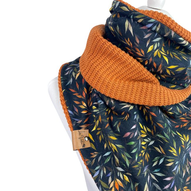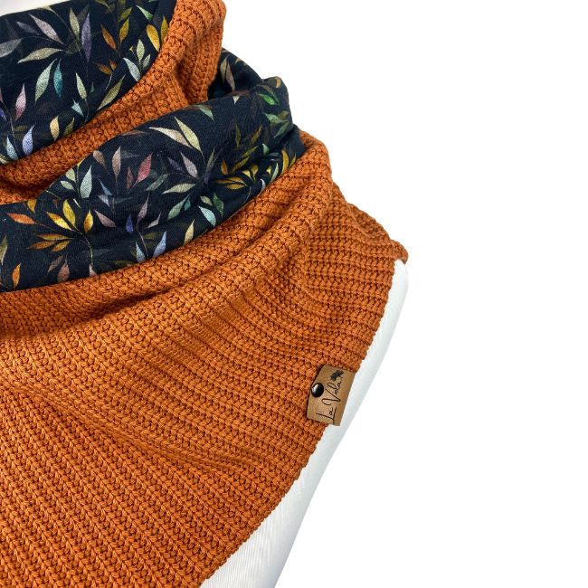 Wunderbarer weicher Grobstrick in der Farbe Cognac trifft auf wunderschönen Baumwollfleece in buntem Herbstmuster.