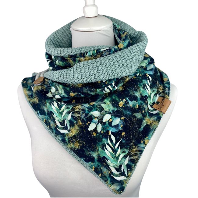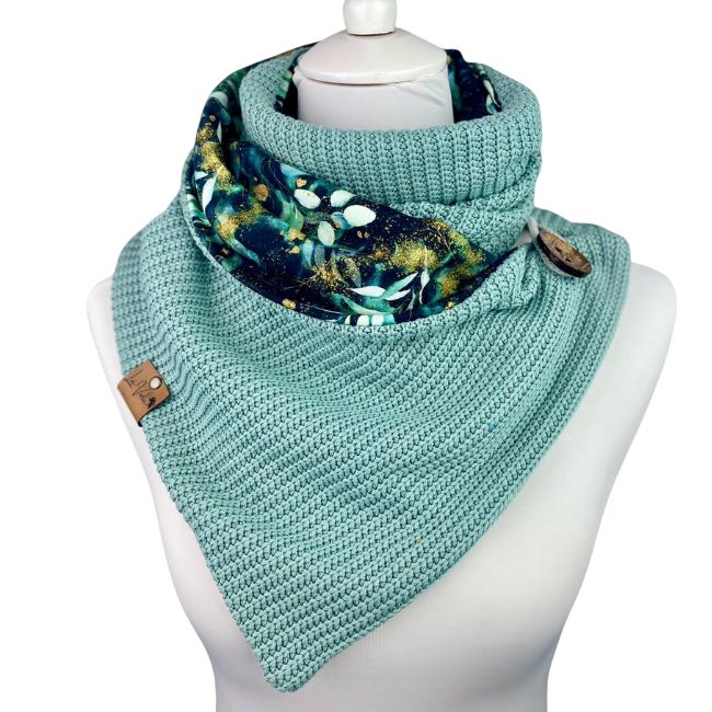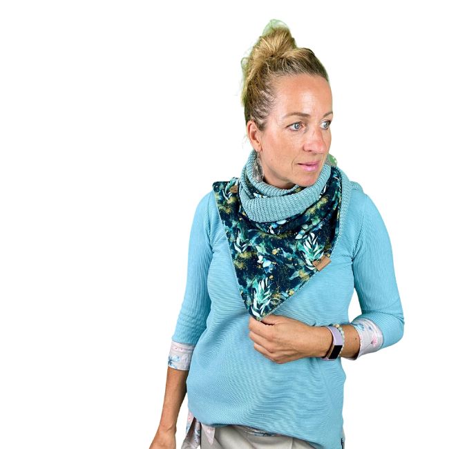 Der Wickelschal hat die Optik eines Dreiecktuchs. Er ist herrlich weich und kuschelig und kann ebenfalls von beiden Seiten getragen werden. Der Schal wird 2x um den Hals geschlungen und mit einem Knopf geschlossen.