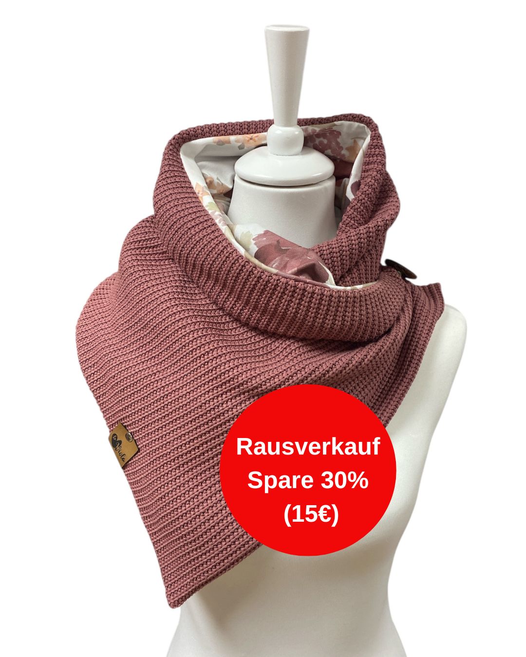 Der Wickelschal hat die Optik eines Dreiecktuchs. Er ist herrlich weich und kuschelig und kann ebenfalls von beiden Seiten getragen werden. Der Schal wird 2x um den Hals geschlungen und mit einem Knopf geschlossen.