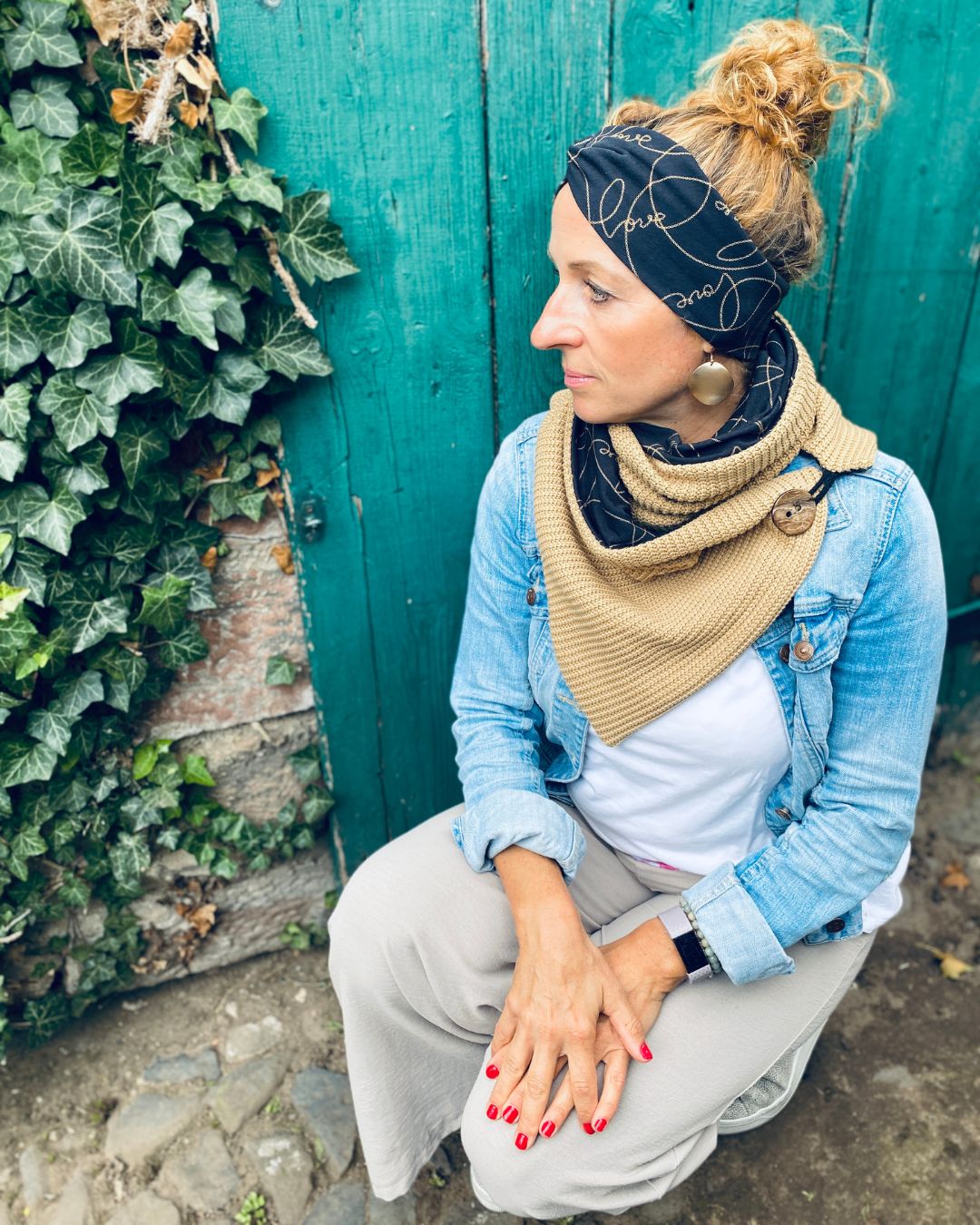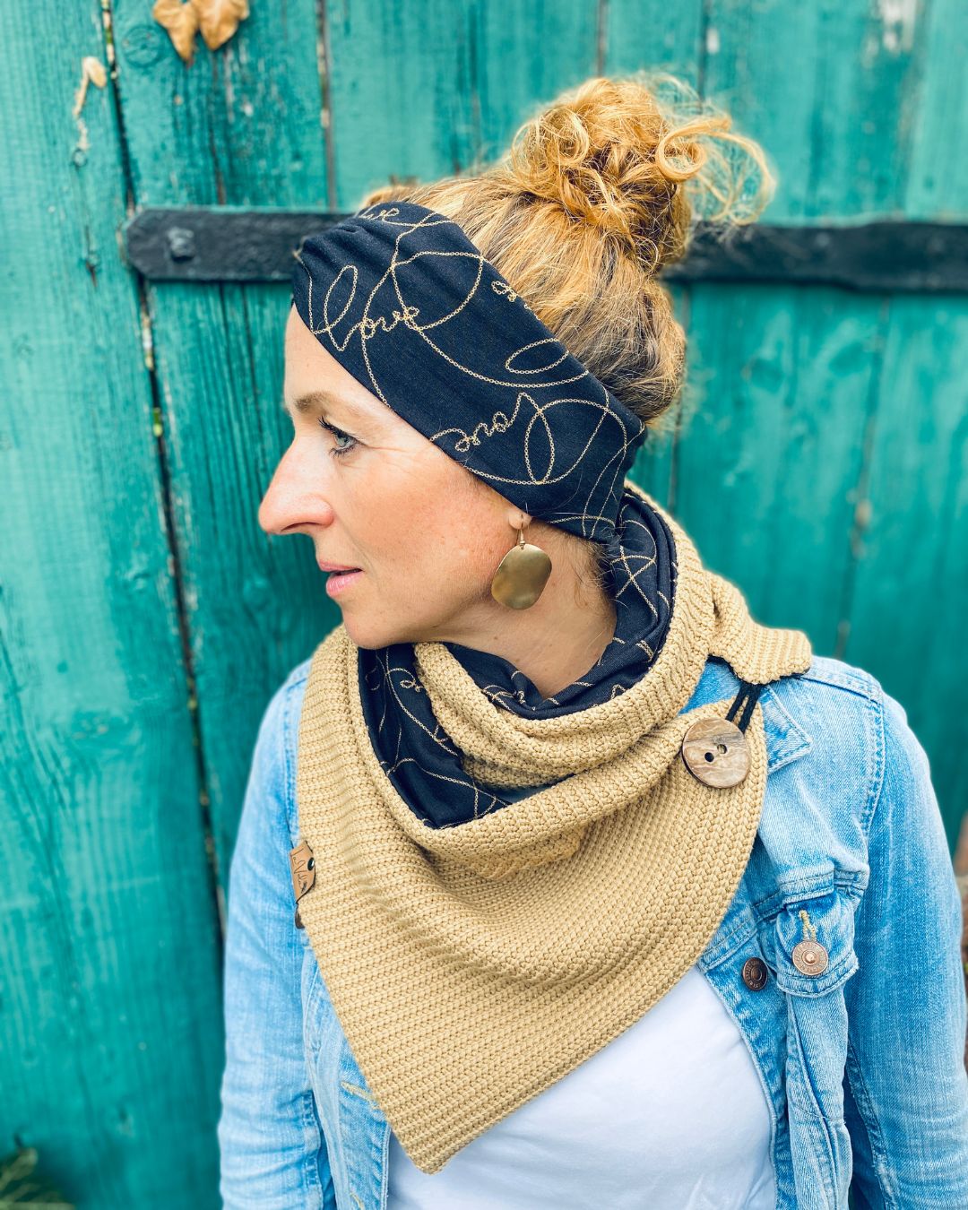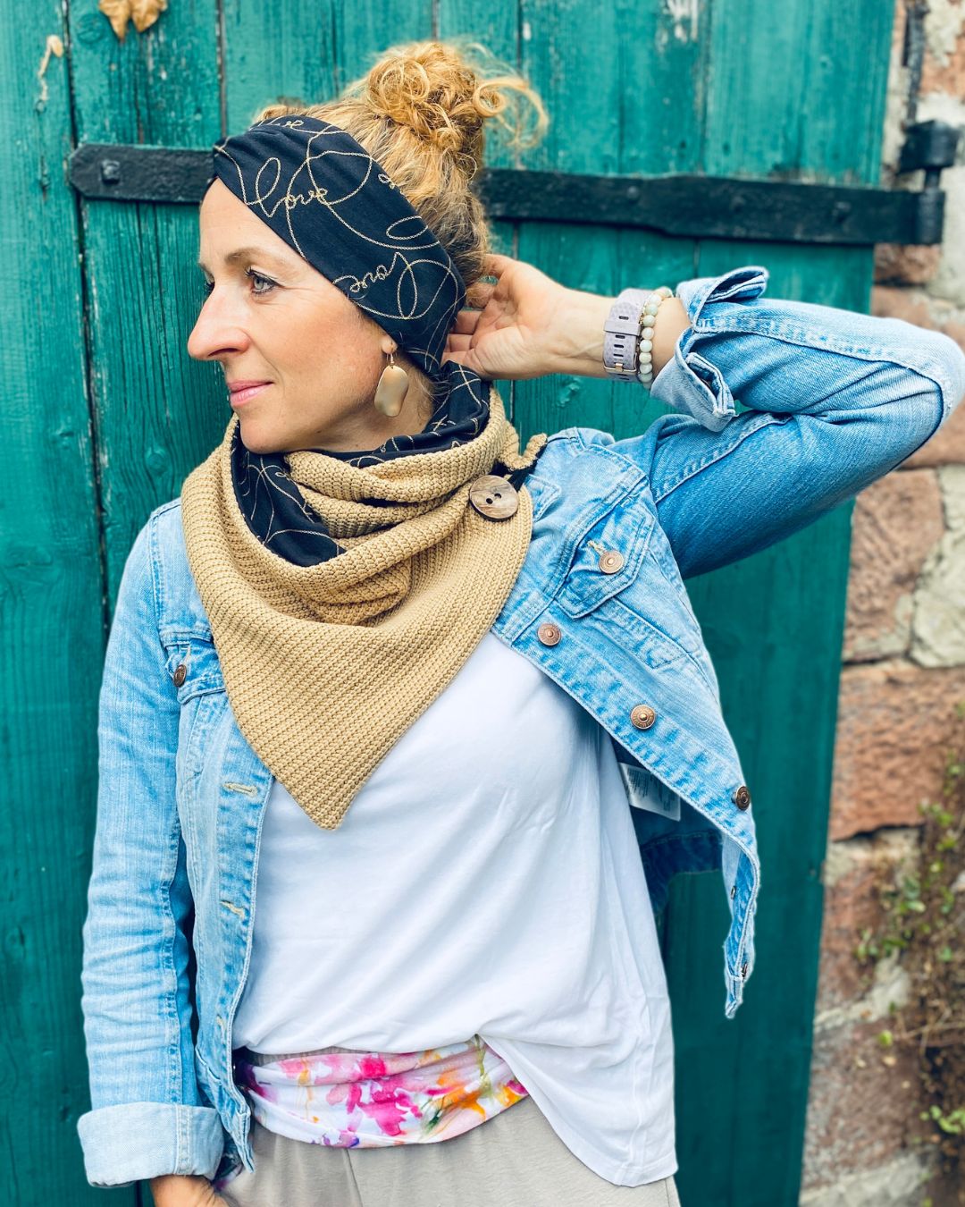 Der seitliche Knopf macht den Wickelschal zu einem ganz besonderen Accessoire.
