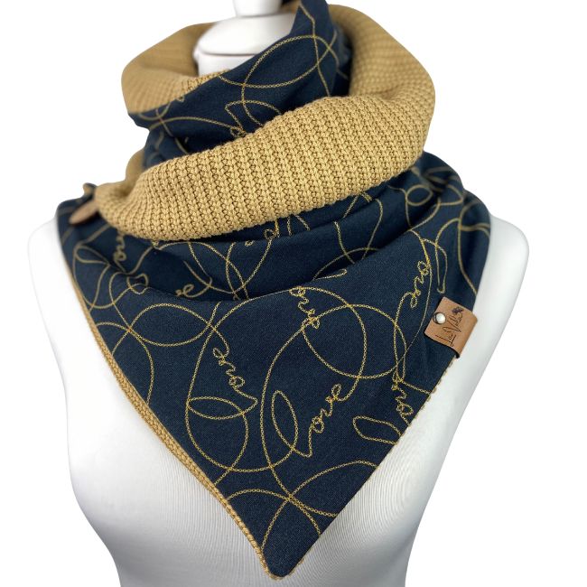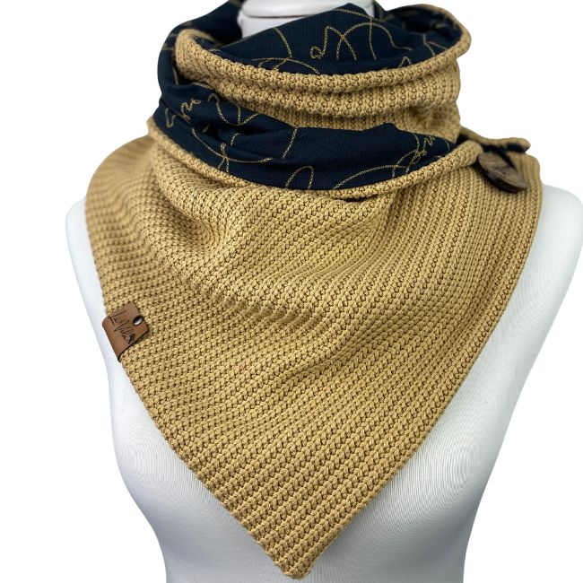 Der Wickelschal hat die Optik eines Dreiecktuchs. Er ist herrlich weich und kuschelig und kann ebenfalls von beiden Seiten getragen werden. Der Schal wird 2x um den Hals geschlungen und mit einem Knopf geschlossen.