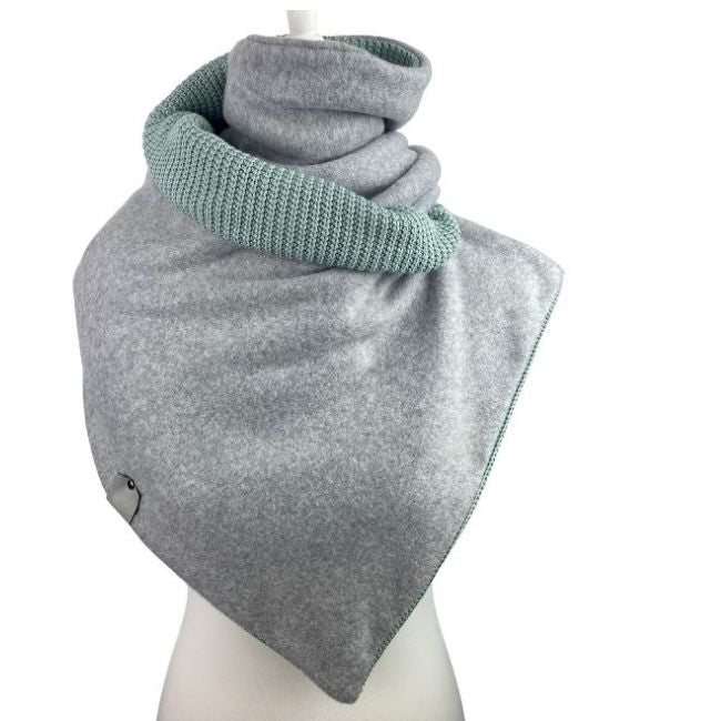 Der Wickelschal hat die Optik eines Dreiecktuchs. Er ist herrlich weich und kuschelig und kann ebenfalls von beiden Seiten getragen werden. Der Schal wird 2x um den Hals geschlungen und mit einem Knopf geschlossen.