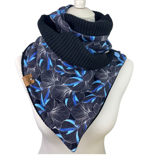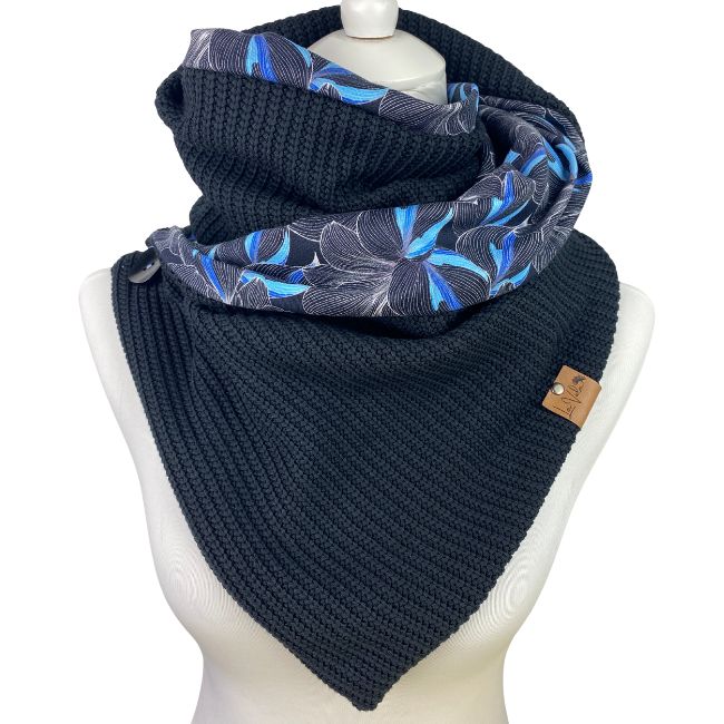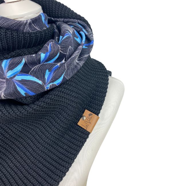 Wunderbarer weicher Grobstrick in der Farbe Schwarz trifft auf wunderschönen Baumwollfleece in blauem Blumenmuster.