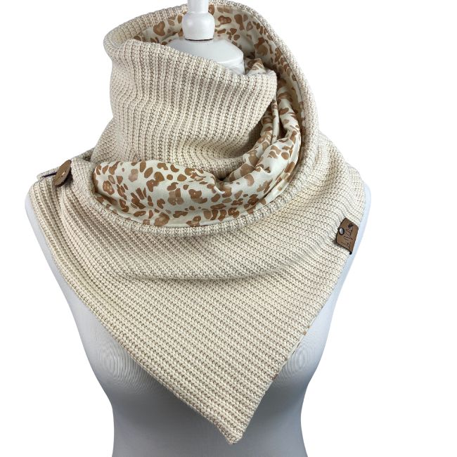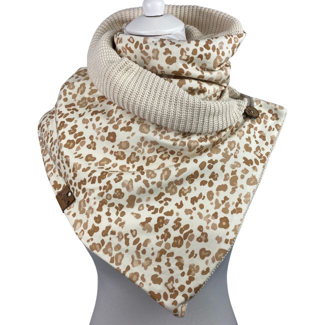 Wunderbarer weicher Grobstrick in der Farbe Naturell trifft auf wunderschönen Baumwollfleece in hellem Leomuster.
