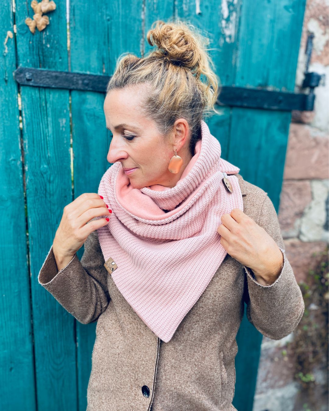Der Wickelschal hat die Optik eines Dreiecktuchs. Er ist herrlich weich und kuschelig und kann ebenfalls von beiden Seiten getragen werden. Der Schal wird 2x um den Hals geschlungen und mit einem Knopf geschlossen.