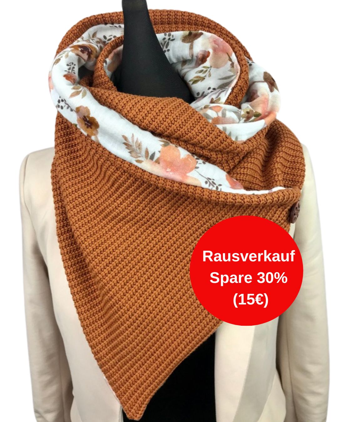 Wunderbarer weicher Grobstrick in der Farbe Cognac trifft auf wunderschönes Musselinmuster mit Blüten.