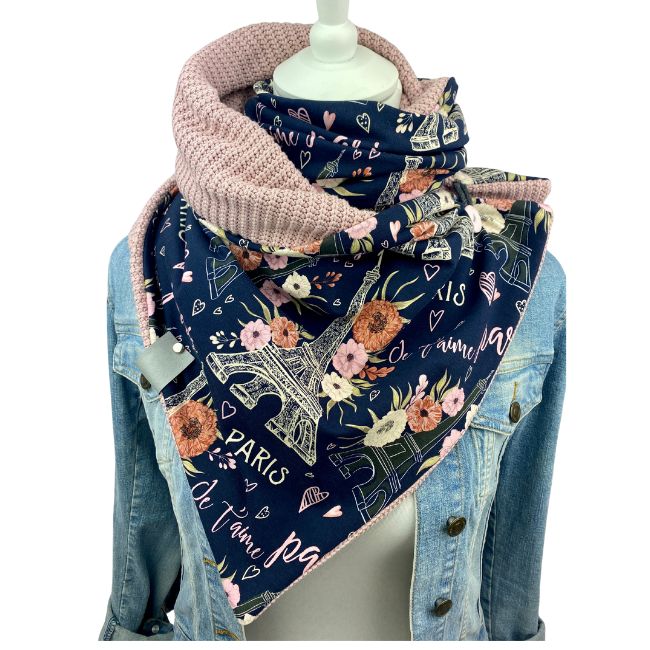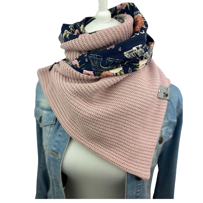 Der Wickelschal hat die Optik eines Dreiecktuchs. Er ist herrlich weich und kuschelig und kann ebenfalls von beiden Seiten getragen werden. Der Schal wird auch 2x um den Hals geschlungen und mit einem Knopf geschlossen.